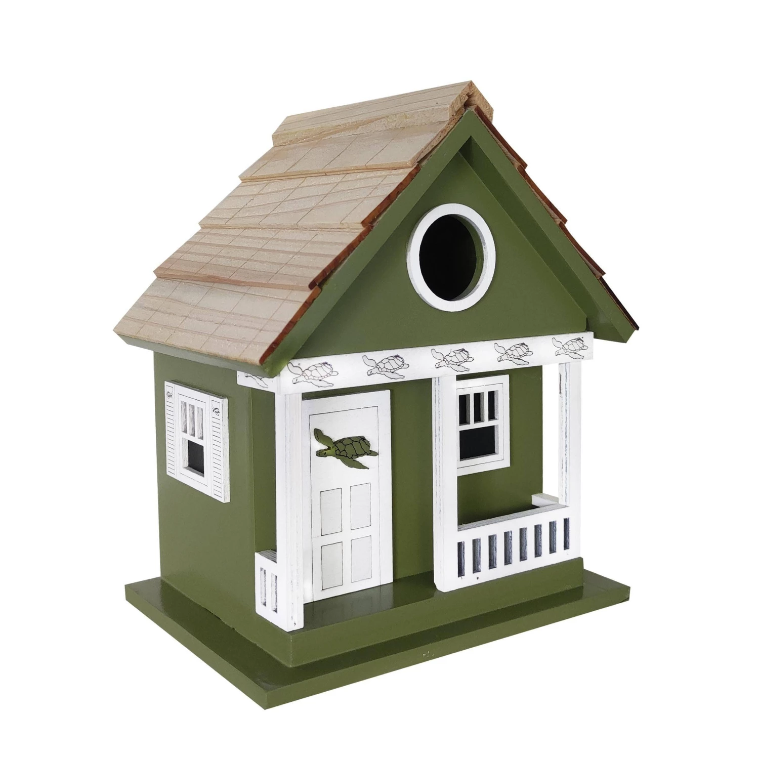 The Turtle Cottage Birdhouse in olive green features a turtle motif with “punched-out” details along the porch and side window trims. The front door is decorated with a swimming turtle icon . A removable back wall, drainage, ventilation, an unpainted interior and a 1.25″ hole size will invite nesting birds in and keep larger ones out. The finish is an outdoor, water-based, non-toxic paint. Likely inhabitants may include chickadees, nuthatches, wrens and titmice. Keyhole back hardware makes hanging this beautiful birdhouse a cinch.
