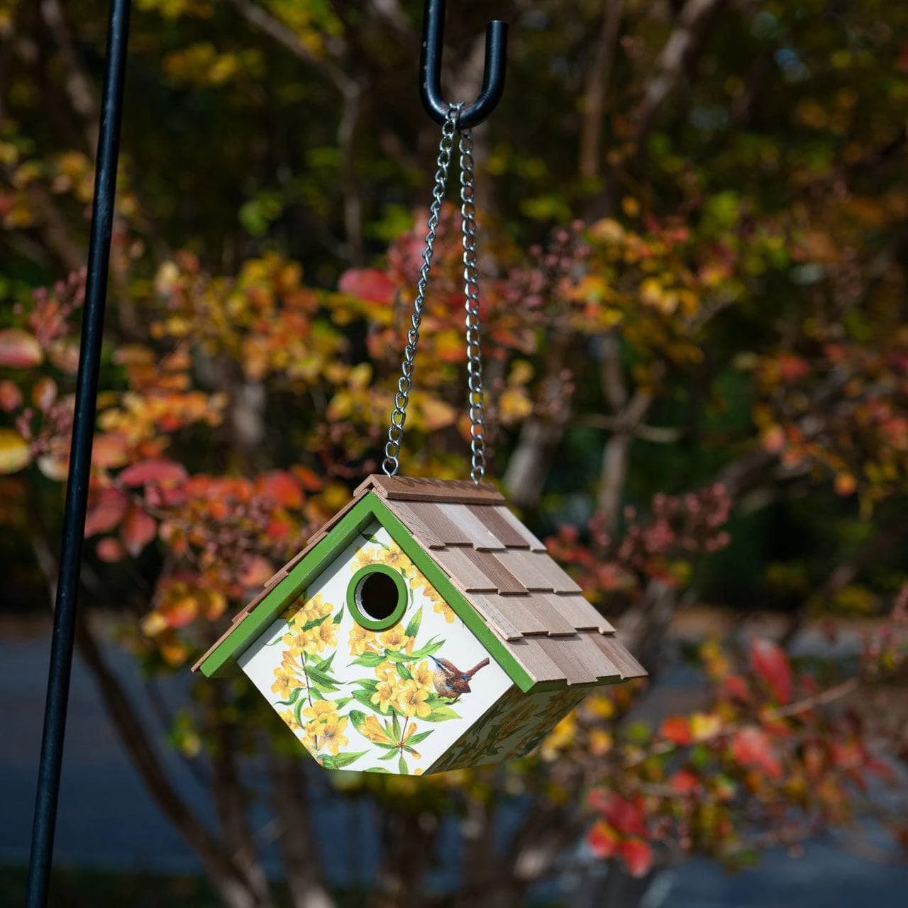 This fully functional hanging wren house is decorated with the Yellow Jessamine, the state flower of South Carolina and is designed to accommodate house wrens, one of the only species that enjoy a swinging nest box! Topped with Cedar shingles. The house can be hung on its sturdy galvanized metal chain or fixed to a fence post with its pre-installed key-hole hardware. The slide-out, bottom panel can be removed for easy yearly cleaning.